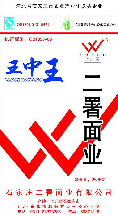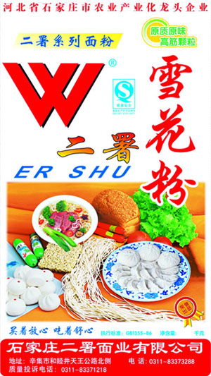 河北面業         二署面業有限公司創建于1989年,現已具備日處理小麥300噸的能量,產品質量穩定,深受客戶青睞。 二署面業地理位置優越,北靠307國道石黃高速,南鄰石德鐵路,衡井國道,交通十分方便,為貨物運輸提供保證及時運輸的天然條件。產品運銷:黑龍江、吉林、遼寧、河北、內蒙、陜西、山西等大中省份,贏得了廣大消費者的認可。 河北面業